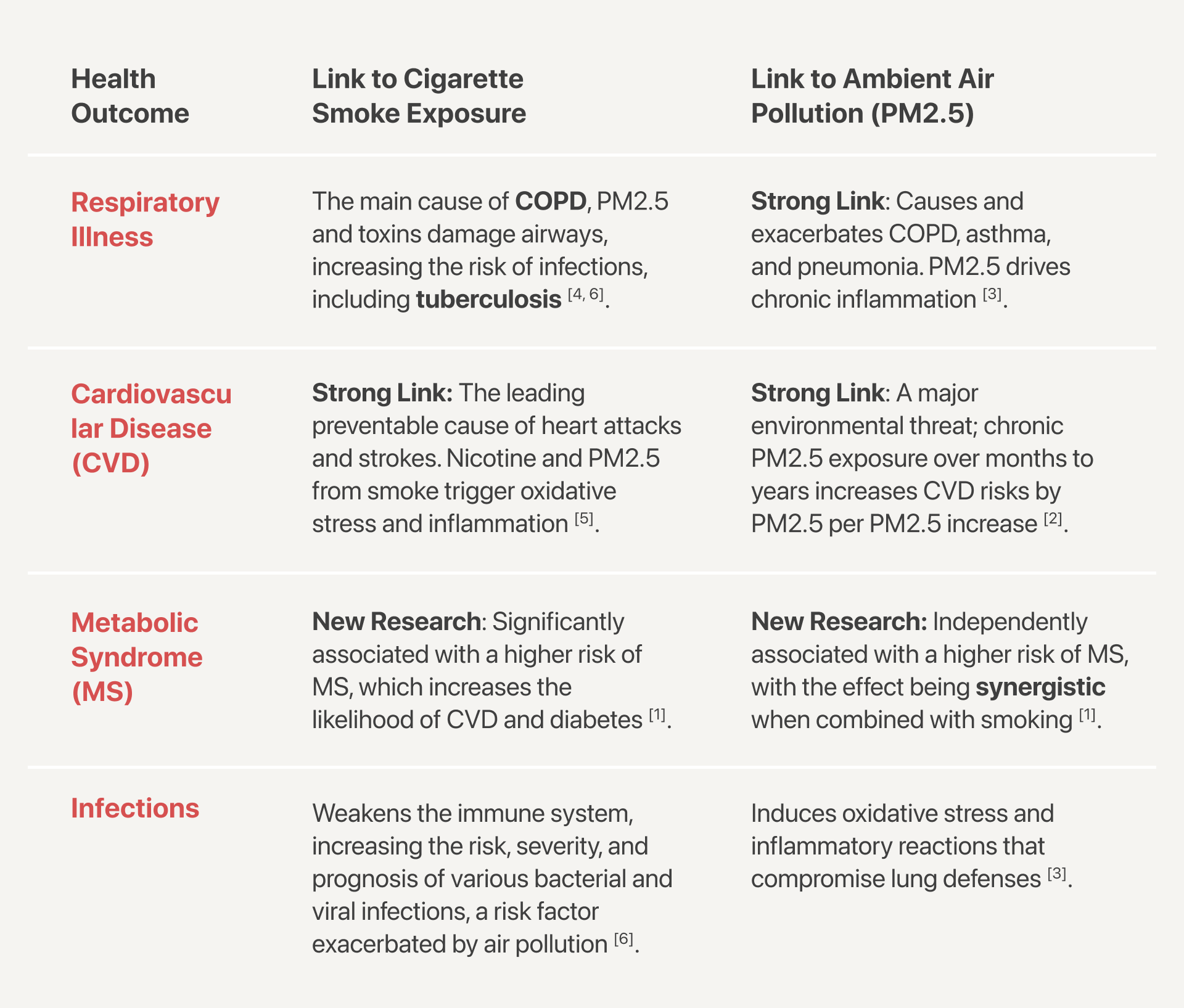 A key 2024 study investigated this joint effect and confirmed that PM2.5 exposure and cigarette smoking were independently and jointly associated with a higher risk of Metabolic Syndrome (MS). Specifically, the group with the highest combined exposure (current smokers in the highest PM2.5 quartile) had the highest odds of developing MS, confirming that the two exposures compound the risk [1].